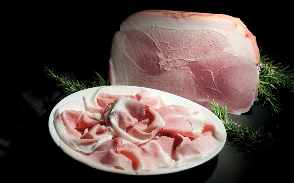 Le secret du jambon cuit Pernigotti réside dans la technique du salage en veine : les cuisses de porc sont injectées manuellement à 2 atmosphères d’une solution d’eau, de sel et d’arômes naturels, permettant à la saumure de se répartir uniformément via les capillaires, sans détériorer la texture musculaire.