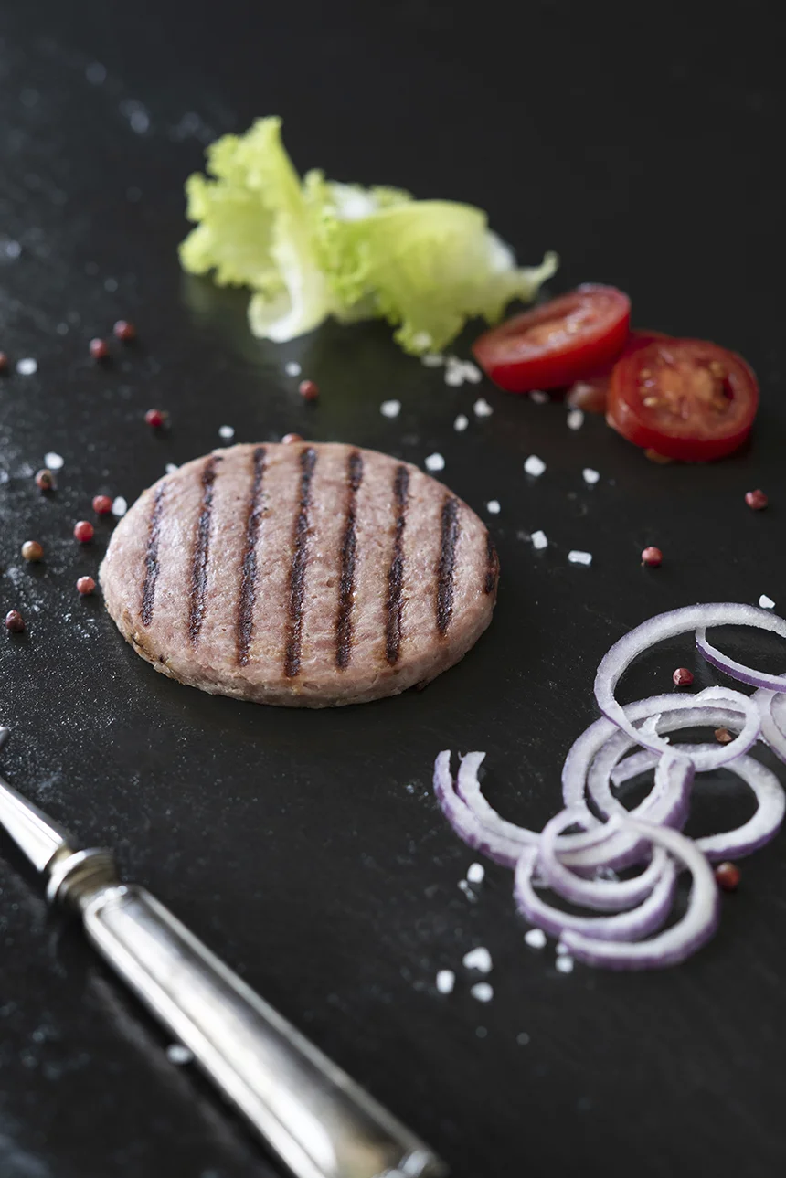 L’hamburger précuit est issu de la parfaite union de viandes de porc et de bœuf, hachées ensemble et assaisonnées avec un mélange équilibré d’herbes aromatiques.
