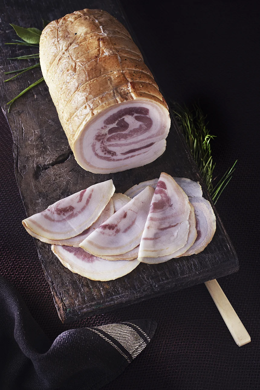 La Pancetta est marinée avec le même mélange d’herbes et aromes utilisés pour la conservation du jambon cuit. La viande est ensuite enroulée et cuite à basse température.