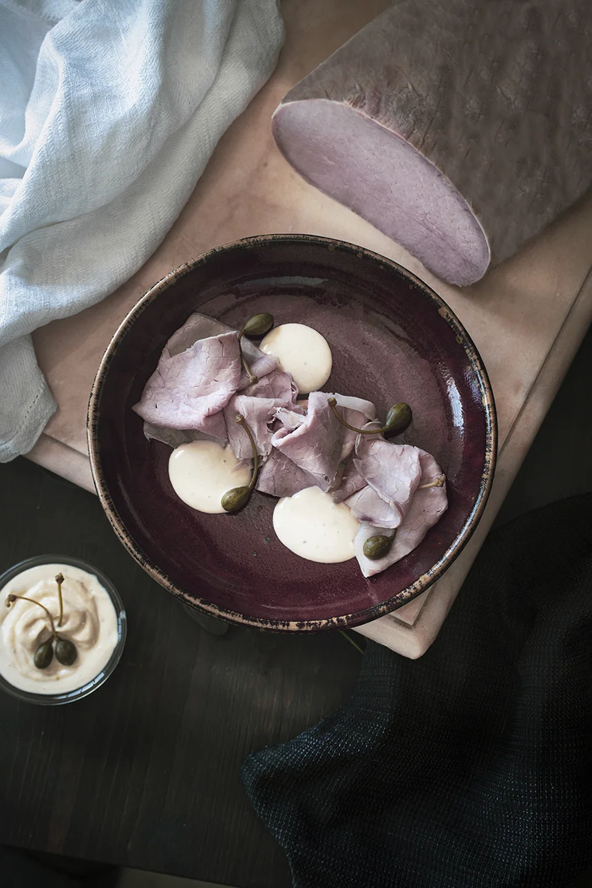 Le « Vitello Tonnato » (rôti de veau tranché à la sauce au thon) est un plat typique de la culture gastronomique piémontaise qui naît de l’union du gîte à la noix de bœuf et d’une sauce aux câpres, thon et œufs.