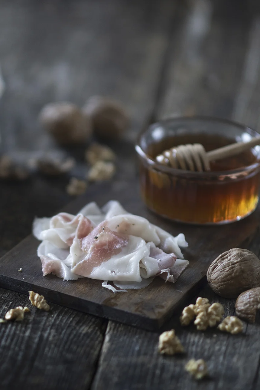 Cette charcuterie est obtenue de l’épaule de porc et elle est faite macérer en ajoutant du sel pendant 4/6 semaines.