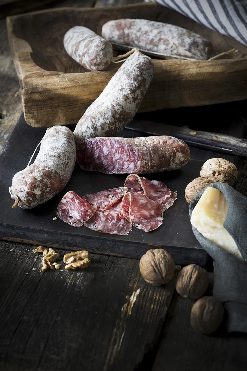 C’est le saucisson idéal pour casser la croûte l’après-midi ou pour accompagner un apéro entre amis. Il peut être dégusté même après quelques jours d’affinage, afin d’en savourer pleinement les caractéristiques typiques de la viande à peine épicée. Il est de forme légèrement courbée à cause du boyau naturel dans lequel il est embossé